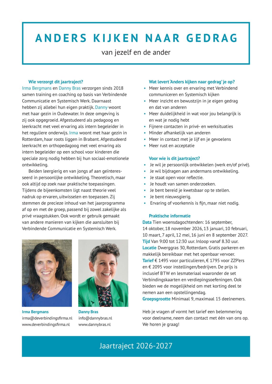 Gun jij jezelf ook deze persoonlijke ontwikkelingsreis die je kunt toepassen binnen je werk of privé? Mijn collega Irma Bergmans en ik zien jou graag bij de start van de volgende groep op woensdag 16 september 2026!
